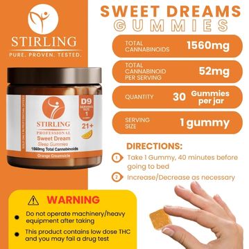 Stirling’s Sweet Dreams Gummies combine low THC, CBD, and CBN, these gummies promote relaxation and improved sleep quality without the psychoactive effects associated with high doses of THC.