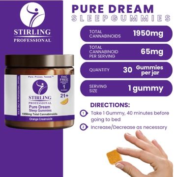 Stirling’s Pure Dream Sleep Gummies are CBD, CBN, and a relaxing blend of natural ingredients, including ashwagandha. These gummies offer a restorative sleep, reducing stress and are completely THC free.